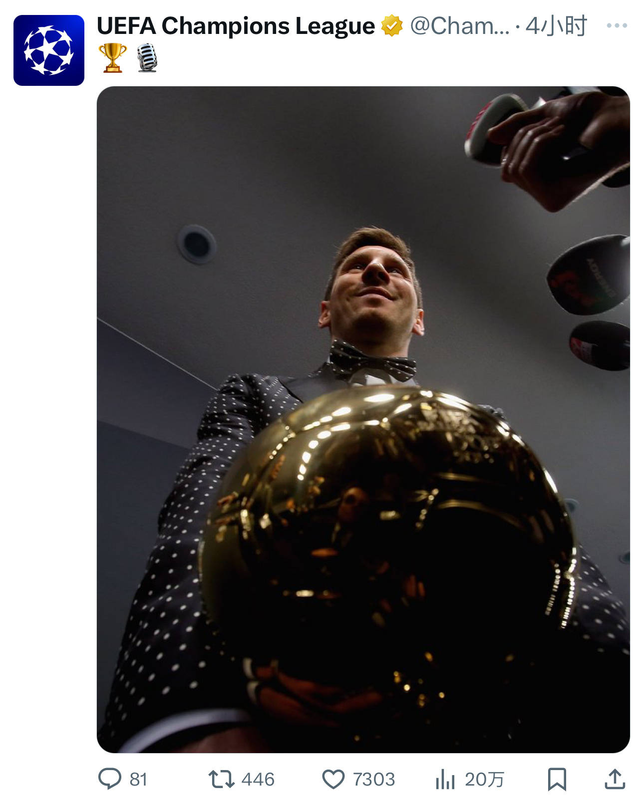 欧冠官方不止一次发过这张照片,他们在去年年初也发布同样的照片。这是一个仰视的镜头,梅西领取金球奖后接受媒体采访。欧冠的配文是两个emoji,一个是冠军奖杯,一个是话筒。意思就是梅西领取代表世界年度最佳球员的金球奖后接受采访。
